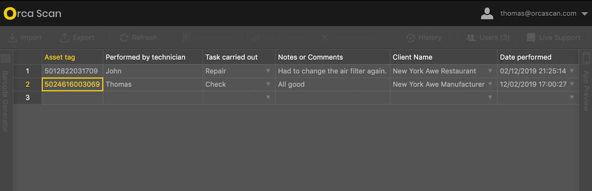 The main view in your Orca Scan Cloud sheet shows the current status of all items and last changes made - that could be the last location an item was scanned, the current stock level or in the case below, the latest servicing of industrial machines.